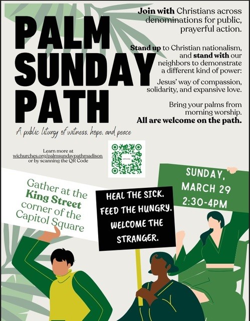 Palm Sunday Path: FOL congregants have been invited by Christ Presbyterian Church Leadership to attend a Palm Sunday public gathering Sunday, March 29, from 2:30–4:00 PM at the Capitol Square (meeting at the King Street corner). Christians from across denominations will come together for a prayerful, visible witness of hope, peace, and the way of Jesus in standing up to Christian nationalism. Entering Holy Week, the hope is to reflect on how Jesus confronted harmful powers, not with force, but with compassion, solidarity, and expansive love. This is an opportunity to unite, be encouraged, and step into a shared expression of faith that points toward healing, justice, and welcome for all: feeding the hungry, caring for the sick, and embracing the stranger. Learn more at wichurches.org/palmsundaypathmadison.