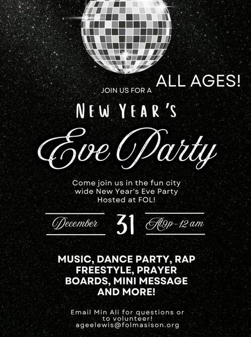 New Year's Party: Ring in the New Year with us at our All-Ages New Year’s Party—we’re teaming up with our brothers and sisters from across the city for one unforgettable night! Expect live music, an epic dance party, a rap freestyle showdown, interactive prayer boards, a powerful mini message, and so much more! The party begins at December 31st, 9 PM at FOL. Let’s celebrate all God has done in 2025 and step into the new year with joy, unity, and purpose! Contact Minister Ali for questions or if you want to volunteer.